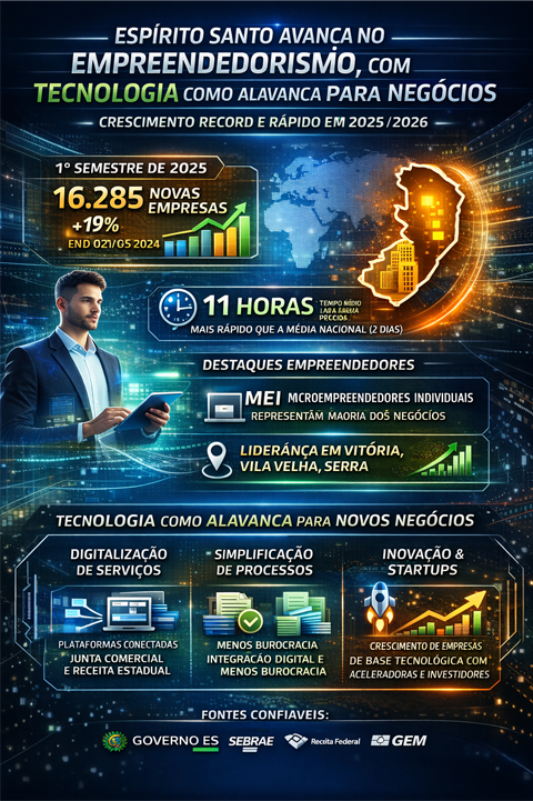 O Espírito Santo vive um novo ciclo de expansão econômica ancorado na tecnologia e na modernização do ambiente de negócios. Entre 2024 e o primeiro semestre de 2025, o estado registrou números recordes na abertura de empresas e consolidou-se como um dos mais ágeis do Brasil para formalização de novos empreendimentos.