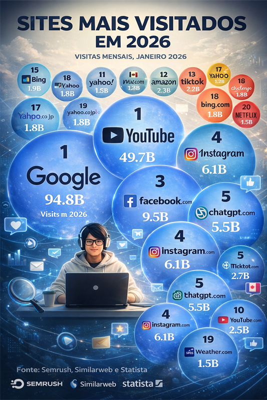 Os dados obtidos sobre audiência digital referentes a janeiro de 2026 indicam que mecanismos de busca e plataformas de vídeo continuam dominando o cenário, mas com uma novidade relevante: a consolidação das ferramentas de inteligência artificial entre os sites mais acessados do planeta.